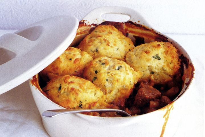 Remove casserole from oven. Use a 60ml (1/4-cup) capacity measuring cup to shape potato mixture into 6 dumplings. Arrange over casserole. Cook, uncovered, for a further 20 minutes. Remove from oven and set aside for 5 minutes to cool slightly before serving.